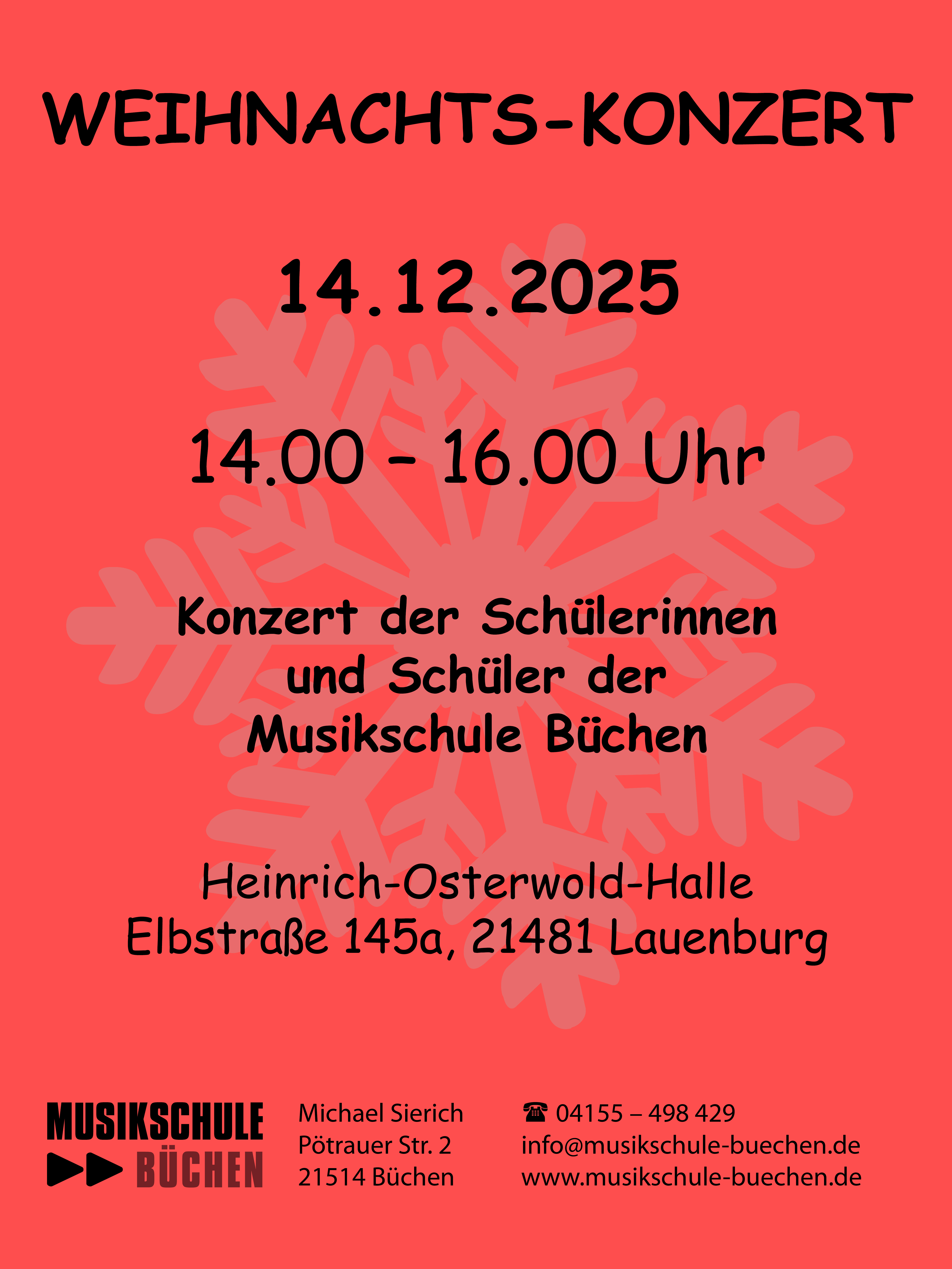 Nach zwei Jahren freuen wir uns sehr, dieses Jahr wieder unser Weihnachtskonzert in Lauenburg in der schönen Heinrich-Osterwold-Halle veranstalten zu können. Wie jeher werden kleine und große Schülerinnen und Schüler uns durch einen musikalisch abwechslungsreichen Nachmittag begleiten. Der Eintritt ist frei.